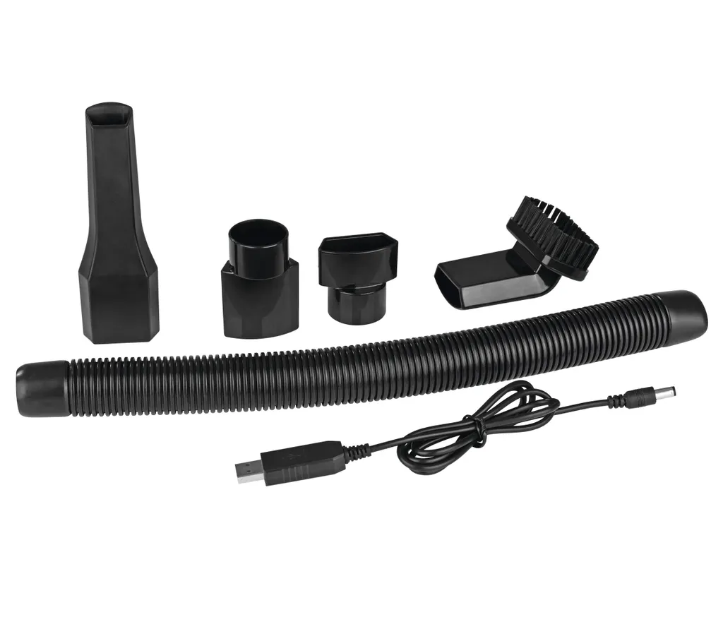 - Lieferumfang: 1x Akku-Handstaubsauger, 1x Fugendüse, 1x Bürstendüse, 1x Verlängerungsschlauch, 2x Adapter 1 x USB-Kabel.