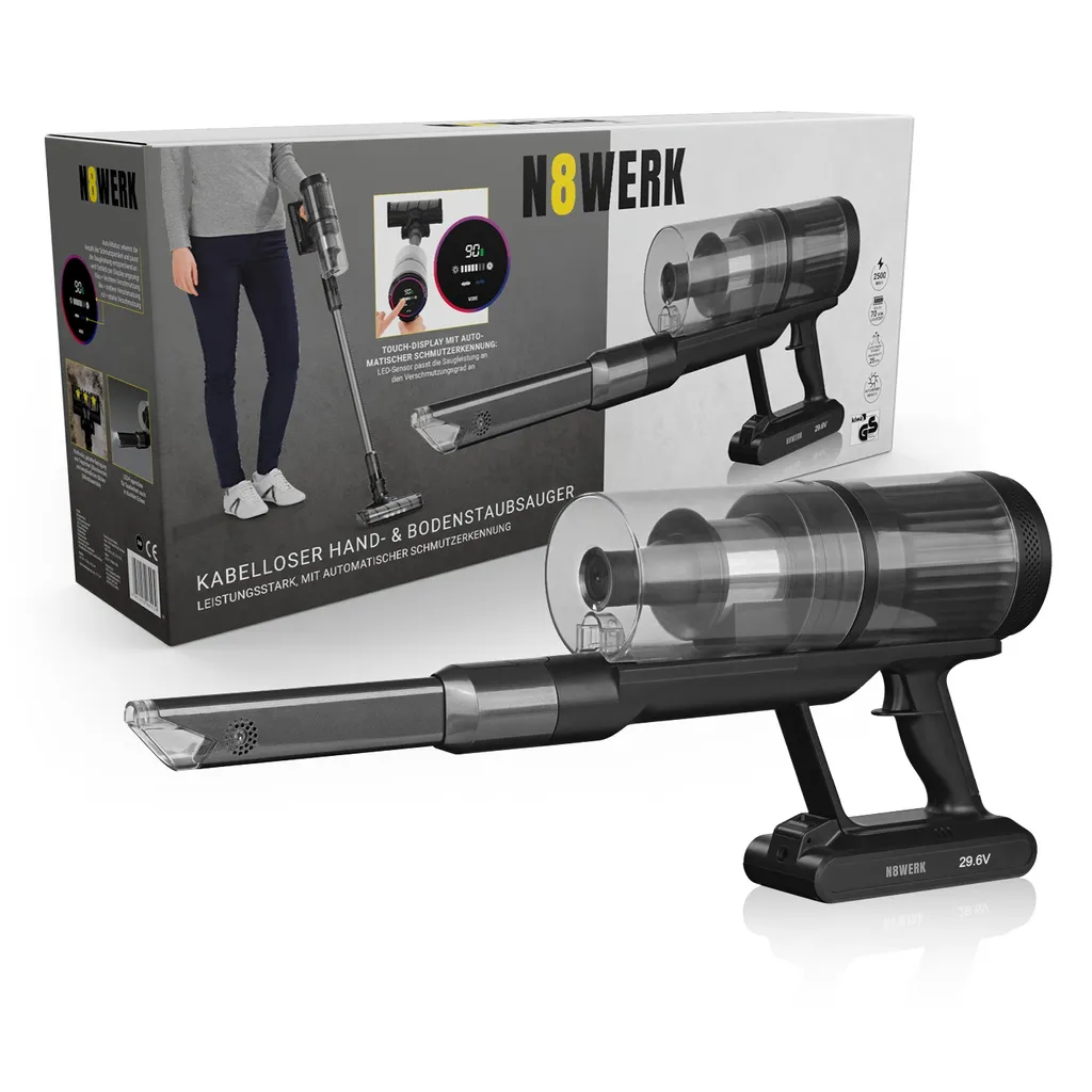 Sorgt auf intelligente Art für Sauberkeit in Ihrem Zuhause: Der leistungsstarke, kabellose N8WERK Hand- und Bodenstaubsauger passt sich flexibel Ihren Bedürfnissen an und dient Ihnen je nach Bedarf als kompakter Hand- oder leichtgängiger Bodenstaubsauger.