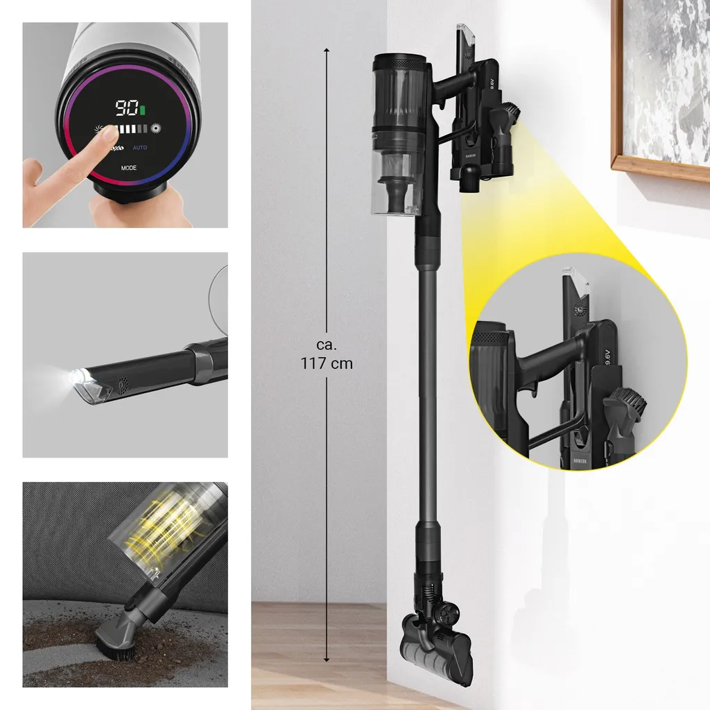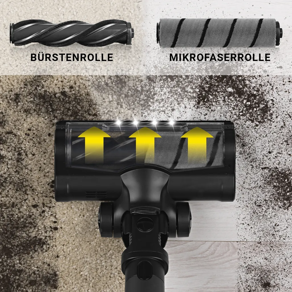 - Lieferumfang: 1 x Staubsauger, 1 x LED-Fugendüse, 1 x Bürstendüse, 1 x Mikrofaserrolle für empfindliche Böden, 1 x Bürstenrolle für Teppiche, 1 x Verlängerungsrohr, 1 x Netzteil mit Ladekabel und Wandhalterung