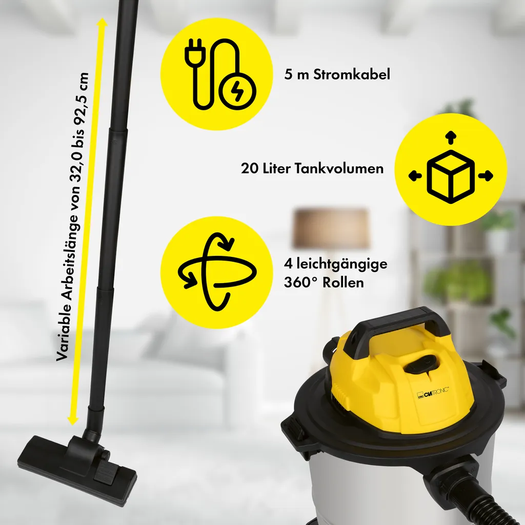 - Komfortabel arbeiten – Der Nass- Trockensauger verfügt über ein extra langes 5m Kabel für einen großen Aktionsradius. Das 3-teilige Saugrohr besitzt eine variable Arbeitslänge von 32,0 bis 92,5cm und die vier leichtgängigen 360° Rollen ermöglichen ein flexibles Arbeiten
