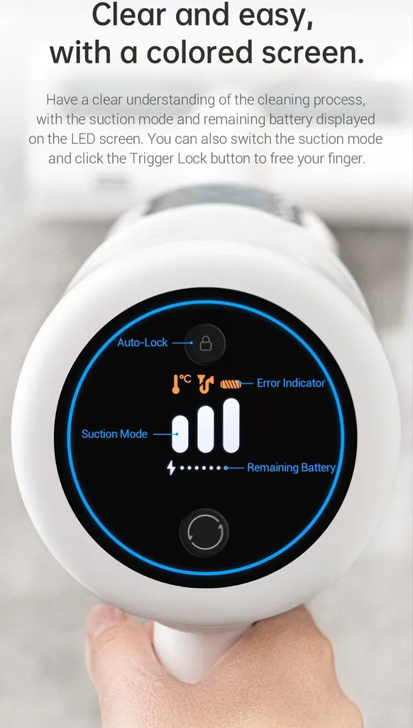 Der intelligente LED-Bildschirm zeigt die Akkulaufzeit, den Reinigungsstatus und die automatische Sperre an