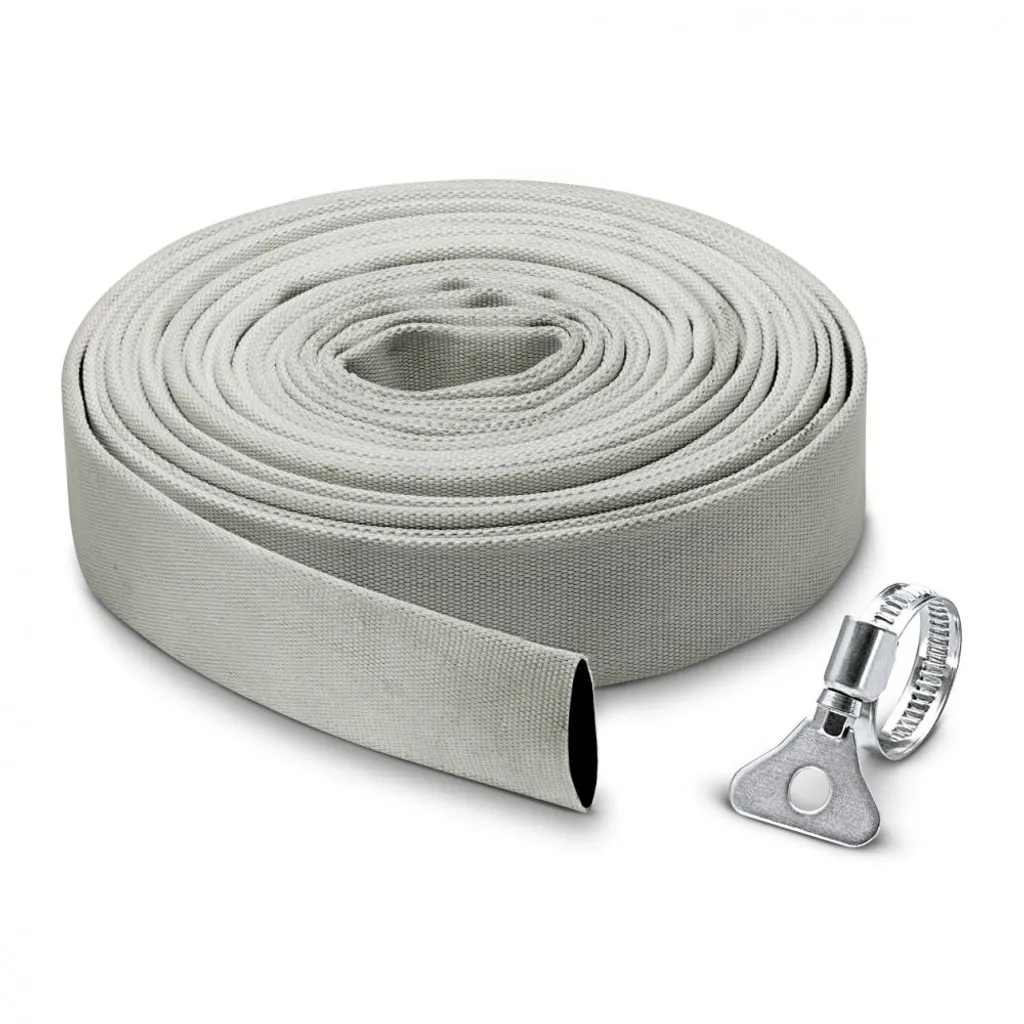 Das Set besteht aus einem flexiblen 1 1/4″-Flachschlauch und einer Edelstahl-Schlauchklemme (30–40 mm) mit Flügelschraube für den werkzeugfreien Anschluss. Besonders empfehlenswert ist das Gewebeschlauchset von Kärcher für die Verwendung mit Klar- und Schmutzwasser-Tauchpumpen. Es ist die ideale Lösung für den Abtransport von großen Wassermengen wie beispielsweise bei Überschwemmungen. Der 10 Meter lange Schlauch ist flach aufrollbar und lässt sich dadurch besonders platzsparend lagern. Der maximale Betriebsdruck beträgt 5 Bar.