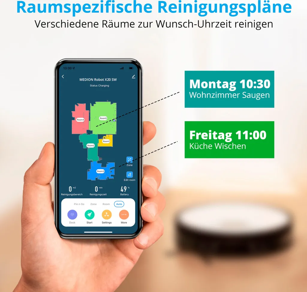 Der MEDION X20 SW+ ist ein hochmoderner Saug- und Wischroboter. Er bewegt sich mit seiner Lasernavigation absolut sicher durch Ihr Zuhause und kartiert Ihre Wohnung maßstabsgetreu. Der integrierte Wandsensor hilft ihm dabei sauber an Wänden entlang zu fahren und Hindernissen präzise auszuweichen. Dank intelligenter Smart-Steuerung reinigt er nicht nur nach einem vorab festgelegten Zeitplan, sondern auf Wunsch auch ferngesteuert per App und Sprache. Das ist ebenso smart wie seine Ladestation – die lädt den Akku und leert gleichzeitig den Staubbehälter, damit Sie es besonders leicht haben. So geht Hausputz heute!