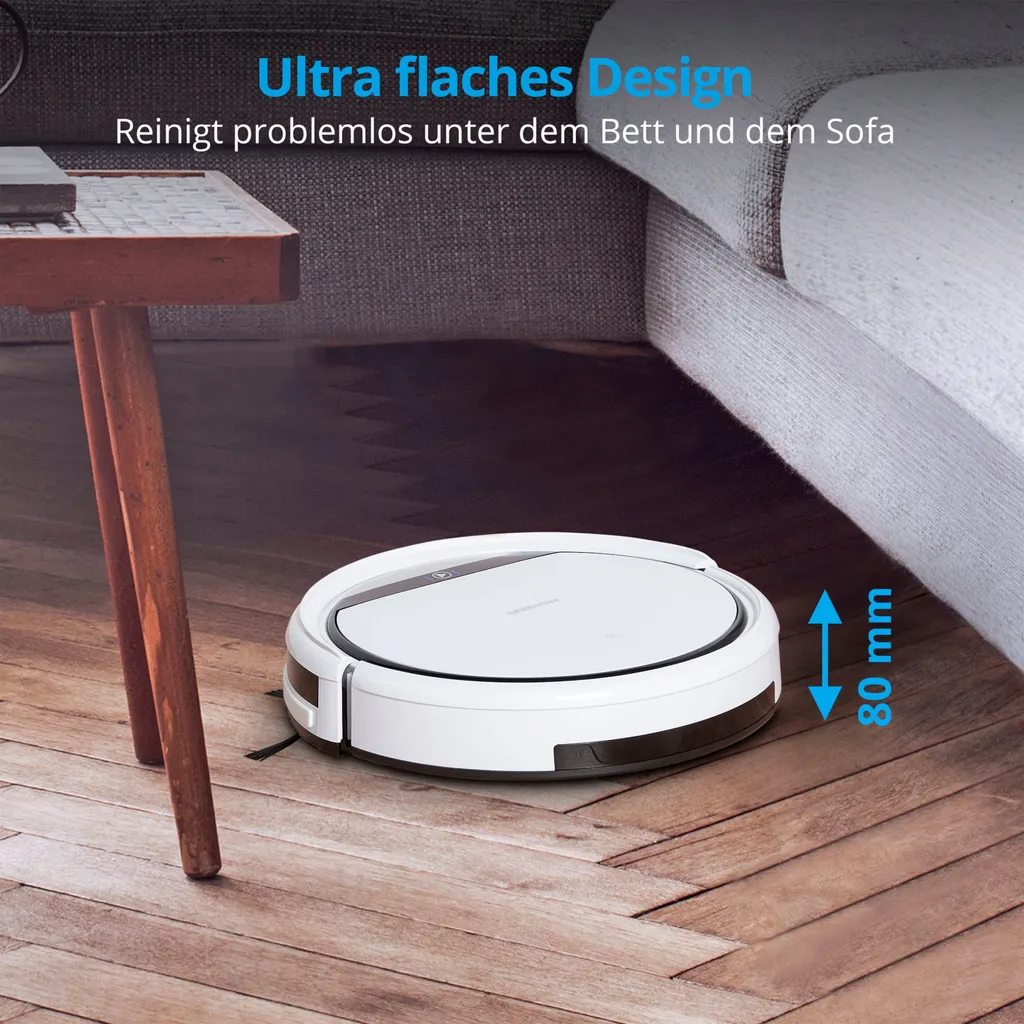 Mit dem MEDION Saugroboter E32 wird die Bodenreinigung für Sie zum Kinderspiel. Der starke Putzteufel ist durch seine speziellen Seitenbürsten perfekt geeignet, um Staub, Haare, Pollen oder Schmutz wirklich überall zuverlässig zu entfernen und Ihnen einen wesentlichen Teil der Hausarbeit komplett abzunehmen. Mit Hilfe moderner Sensoren fährt der MEDION E32 nämlich komplett selbstständig und auf kurzflorigen Teppichen ebenso sicher wie auf Fliesen oder Parkett. Das Beste daran: Durch die flexible Startmöglichkeit inklusive individuell planbarer Zeitpläne geht der Saugroboter auch dann seiner Arbeit nach, wenn Sie gar nicht zu Hause sind oder einfach die angenehmen Seiten des Lebens genießen.
