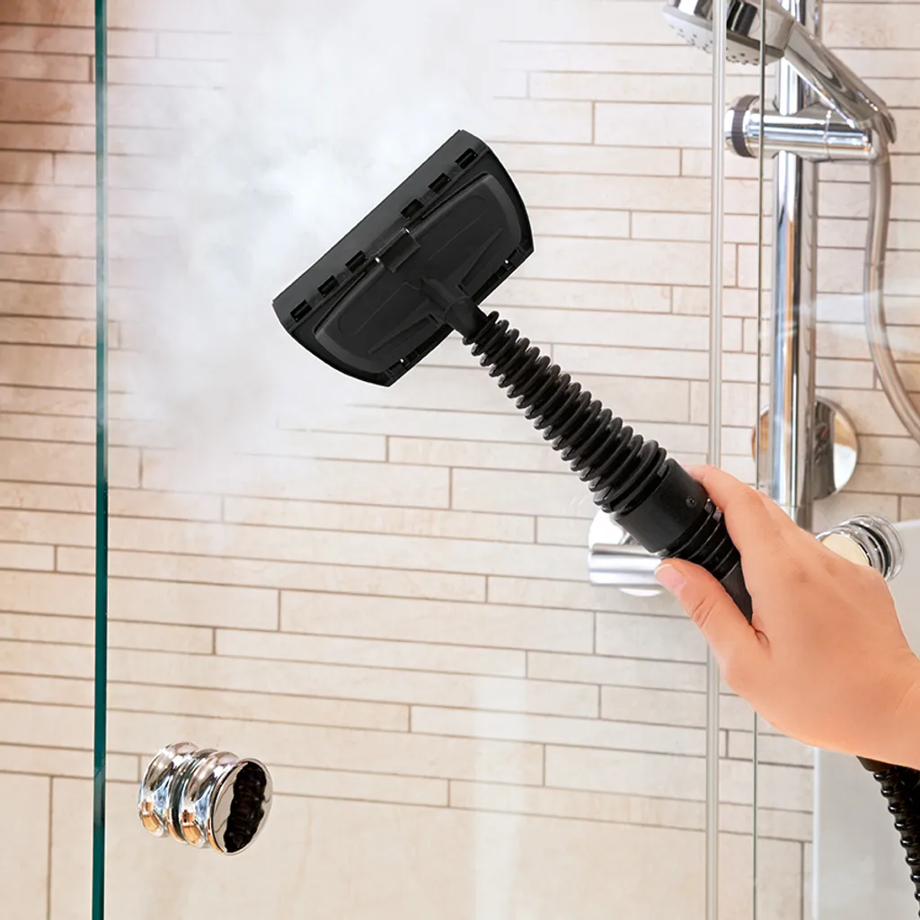 Lieferumfang — Mit insgesamt 9 Zubehörteile sind Sie für eine gründliche Reinigung gerüstet, egal ob es sich um eine große Fläche oder eine kleine Lücke handelt: Bürsten‑, Winkel-, Vlies-, Fensterreinigungs- und universeller Reinigungsaufsatz, 360° schwenkbare Dampfdüse, Schlauch, Messbecher, Trichter