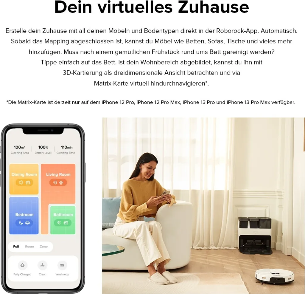 - Auto-Mop Lift: Wenn ein Teppich erkannt wird, kann das Moppmodul bis zu 5 mm angehoben werden.