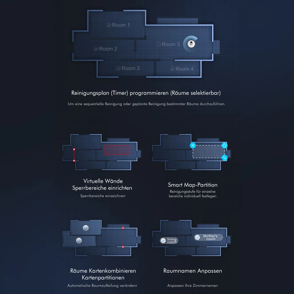 Mit der automatischen KI-Erkennung können Kartenpartitionen automatisch gespeichert werden, und Sie können sie kombinieren, Partitionen formatieren und benennen, um eine sequentielle Reinigung oder geplante Reinigung bestimmter Räume durchzuführen.