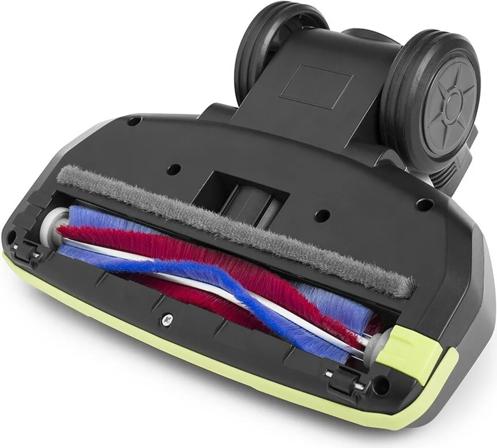 - Die motorisierte Bürste besitzt ein LED Licht – zusätzlich ist eine Kombi-Bürste für Fußleisten und Möbel enthalten
